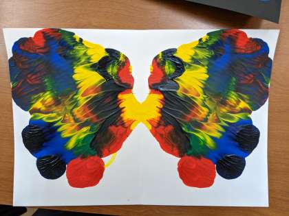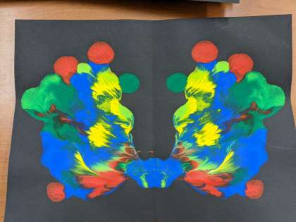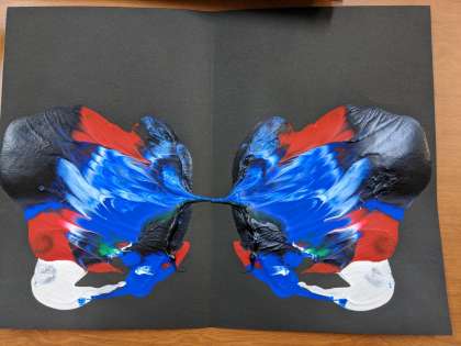 自由に絵の具をつけて画用紙を半分に折り、広げた模様から、何に見えるかを想像する