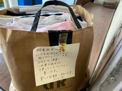 校長室の空気を入れ替えようと出入り口に扉を開けると、机に写真のような紙袋が置かれていました。