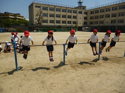 1年生は元気よく、運動場で体育です。