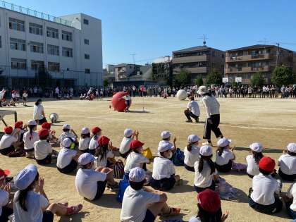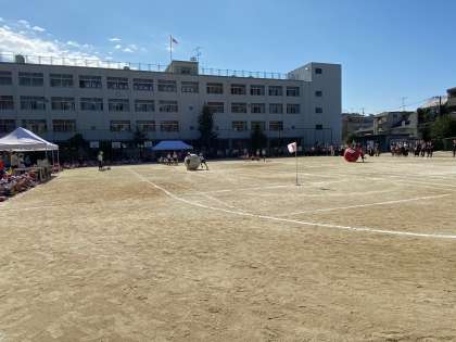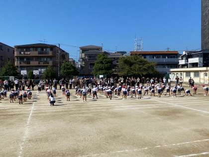 ぬけるような青空の下、1、2年生が元気にかけっこと大玉転がしに取り組みました。