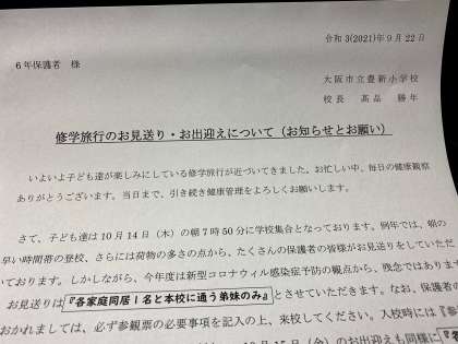 9月22日、すでにお手紙でも配付しておりますが、修学旅行のお見送り・お出迎えについて確認をお願いします。