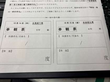 二日間の参観票がありますので、確実に検温をしていただき入校証とともにご持参ください。