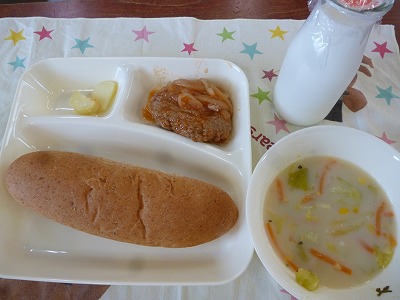 多くの子どもたちが大好きなハンバーグでした。しかも煮込みなので、やわらかく、中までケチャップ味がしみ込んでいておいしかったです。