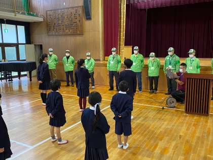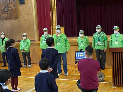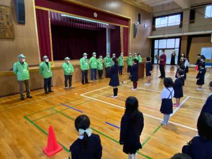 本日、雨の中、講堂にて見守り隊の皆さんにお越しいただき対面式をさせてもらいました。足下の悪い中、子ども達のためにありがとうございました。