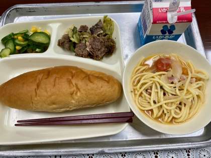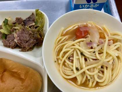 牛肉のカレー風味焼き&ほたて貝とトマトのスープスパゲッティ