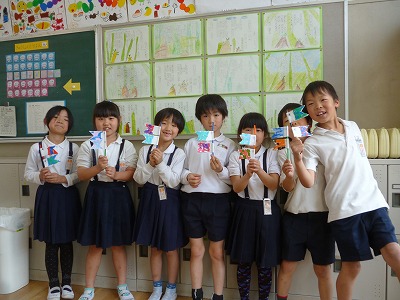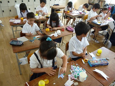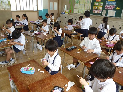 2年生のこのクラスでは、画用紙と折り紙、ストローで、5月5日の子どもの日にちなんで、「ミニこいのぼり」を作っていました。