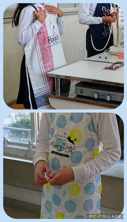 6年生のエプロンは、クリップで紐の長さの調節ができます。