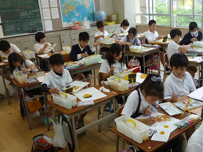 サインペンで輪郭など大まかにスケッチした後、前回より、ほほの部分から色付けを始めていました。