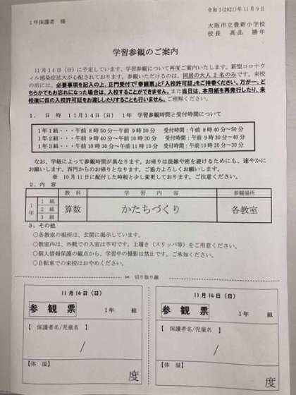 本日、11月14日(日)に予定しております、1年生の学習参観についての手紙を配付しております。感染予防の観点から、学級によって参観時間が異なります。また、お帰りの際には、混雑や密を避けるためにも、速やかに退出いただきますよう、ご協力よろしくお願いします。詳しくは、お手紙をご確認ください。