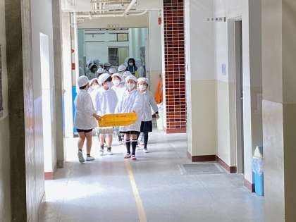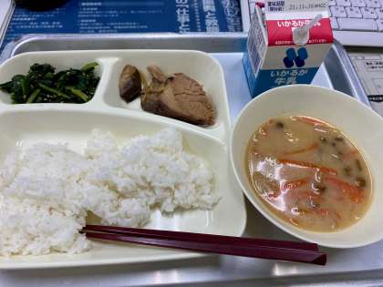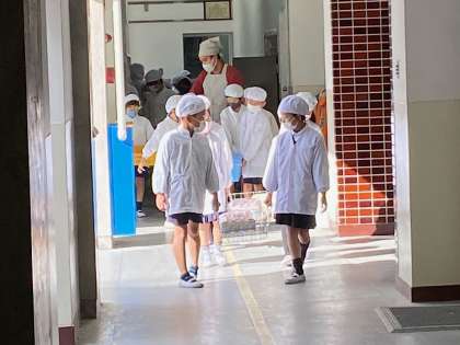 米飯とみそ汁の時の給食当番は運ぶのがとても大変です。