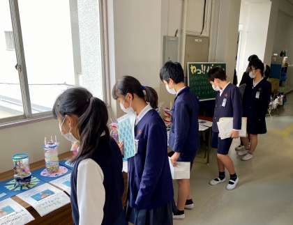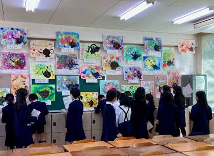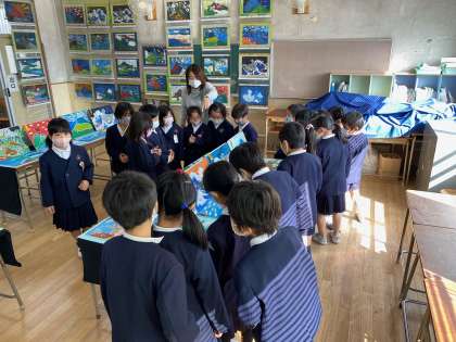 児童も鑑賞しています。お友だちの作品を観ている顔はほんわかしています。お兄さんやお姉さん、弟、妹だけでなく、いろいろな学年の枠を越えて作品を楽しみましょう!