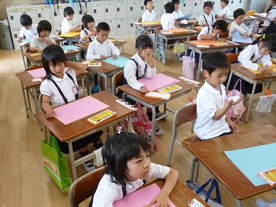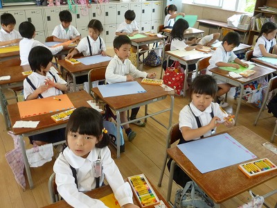 このクラスでは、前回に描いたパスタ(パスでの1本線)のお皿を乗せるマット(ふきん)を色画用紙に思い思いの柄を描いていました。