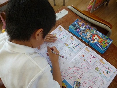 「け」は先生に一発合格、花マルをもらえるのですが、「せ」の文字バランスには多くの子が苦戦していて、「せ」は先生の手直しが入る子が多かったです。