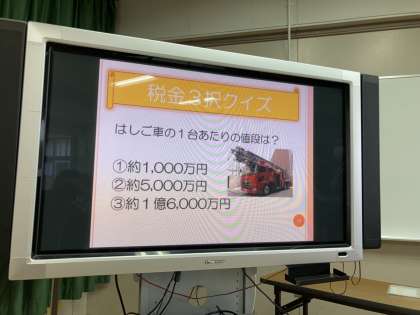 今日は税務署の方に来ていただきました。クイズを交えて税金についてお話しを聞きました。