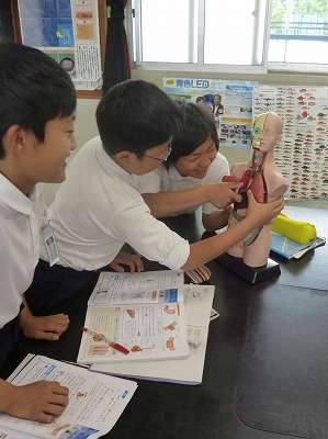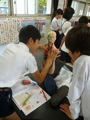 今は消化と吸収について勉強しており、今日は人体模型(内臓がはずれます)を使って、肺・心臓・肝臓・胃・腸の位置関係を学びました。