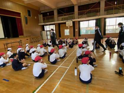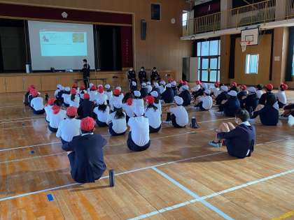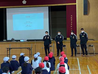 まずは講堂で選手からお話しを聞きます。いつもとは違う学習に、子ども達の目は輝いていました。
