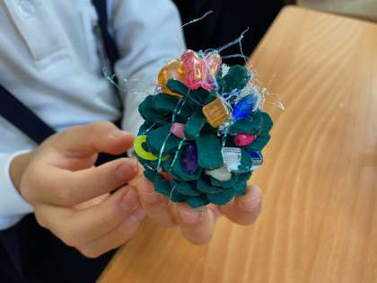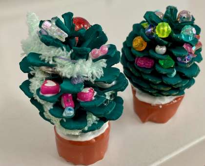 秋で見つけたまつぼっくりを使って、この時期に欠かせない『クリスマスツリー』を作りました。