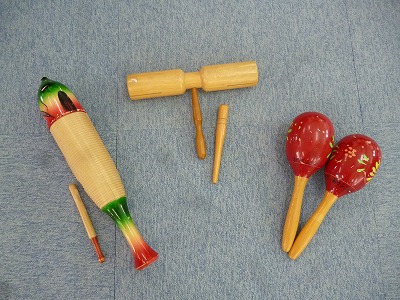 今日は打楽器の「ギロ(左)」「ウッドブロック(中)」「マラカス(右)」を使って、「いろんな木」という曲で、拍の流れにのって、歌と打楽器を合わせて演奏する学習です。