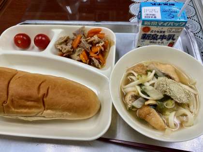 豚肉と野菜の煮もの、なにわうどん&プチトマト
