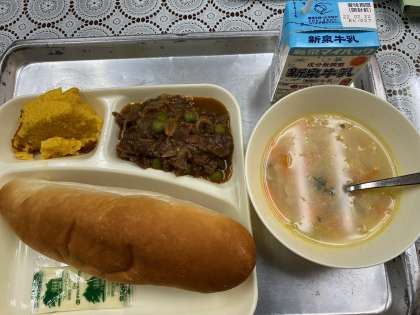 デミグラスソースの味がしっかり牛肉に染みこんでいました。スープのコーンの粒も食感良く食べることができました。