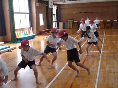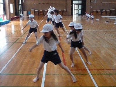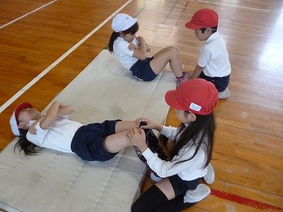 講堂でスポーツテストの「上体おこし」と「反復横跳び」「を実施していました。
