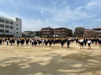 朝会の隊型に初めて並ぶ姿はなんとも幼さが残ります。