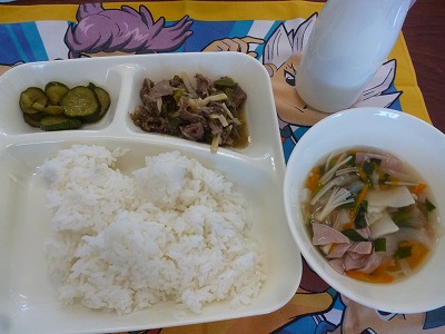 中国語で青椒(チンジャオ)はピーマンのことで、肉絲(ロースー)は肉を細く切ったものという意味です。そして、牛(ニュー)は牛肉のことになり、今日の給食の「青椒牛肉絲(チンジャオニューロースー)」はピーマンと細切り牛肉の炒め物ということになります。