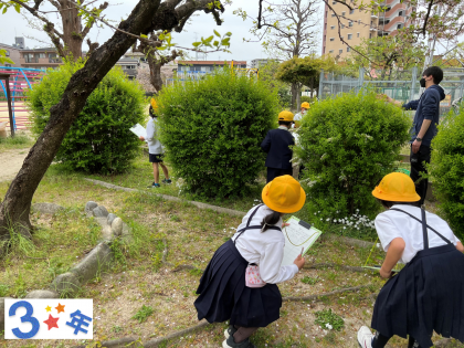 3年生では新しく理科の学習が始まりました。さっそく豊新の森へレッツゴー!