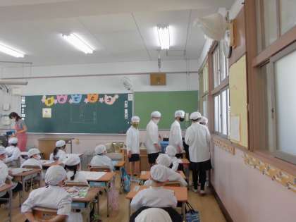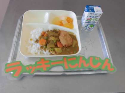 今日のメニューは、(昨日から楽しみにしている子もいました)入学お祝い献立のカツカレーとフルーツゼリーです。1年生の給食は6年生の皆さんが運んでくれました。上手に「ありがとうございました。」が言えていました。