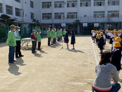 今朝の児童朝会には、見守り隊の皆さんに来ていただきました。