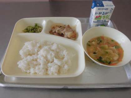 じゃこピーマンは食べやすい甘辛い味付けで、カルシウムもたっぷりです。いろいろな野菜が入ったみそ汁や豚肉のしょうが焼きなど、和風の献立で今日もおいしくいただきました。ごちそうさまでした。
