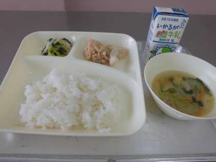 鶏肉のからあげ、中華スープ、チンゲンサイともやしの甘酢あえ、米飯、牛乳