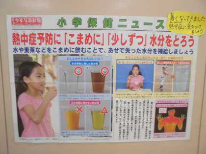 暑くなってきました。熱中症予防のためにも、こまめに少しずつ水分をとりましょう。