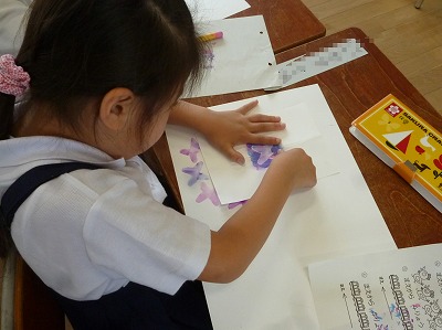 このクラスでは、画用紙を4つに折って、角をはさみで切り取り、それを開いて「アジサイの花の型」として、パスの色を指を使って塗りこんでいき、とてもいい感じのアジサイの花を描いていました。
