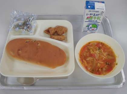 一口トンカツ、ミネストローネ、ミニフィッシュ、レーズンパン、牛乳