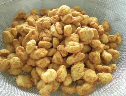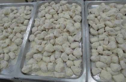 給食室では、小麦粉の量などを丁寧に調整してからパン粉をつけ、一つ一つきれいなキツネ色に揚げてくださっています。