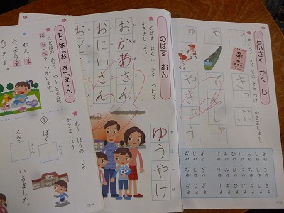 1年生のひらがな帳もどんどん進み、「ちいさく かく じ」「のばす おん」「わ・は お・を え・へ」の学習へと進んでいます。