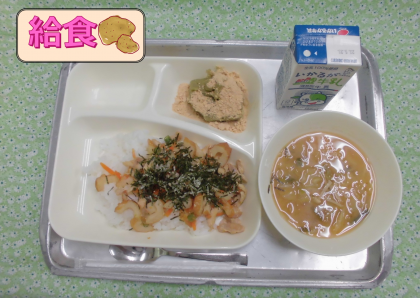 かやくご飯、じゃがいものみそ汁、まっ茶ういろう、牛乳