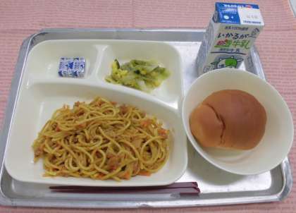 カレースパゲッティ、レタスとコーンのサラダ、固形チーズ、1/2黒糖パン、牛乳