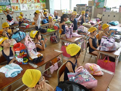 来週からのプール学習を前に、1年生では、プールでの準備物の確認、名前の確認をしました。