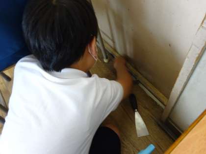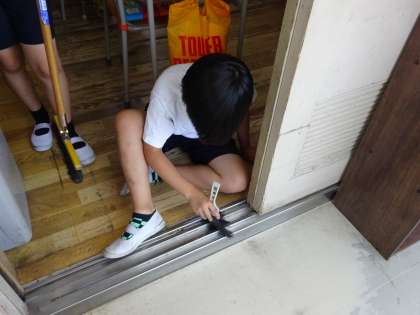 掃除の時間は「無言清掃」に取り組んでいます。ミニほうきでドアの溝掃除、メラミンスポンジやへらで教室のすみっこの場所など細かい部分も自分たちで見つけ、掃除を頑張っています。