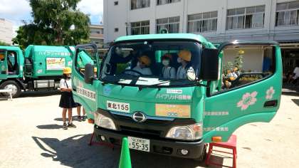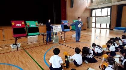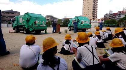 大阪市のごみ処理の職員の方に授業をしていただきました。実際にタンスをパッカー車でつぶしているところを見せてもらいました。つぶす力は3トンもあり、ワニのかむ力と同じそうです。また、つぶすことができないものとしてピアノがあり、子どもたちも驚きました。他にも、パッカー車に乗せてもらったり、ごみの分別体験をしたりしました。