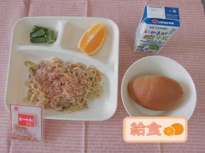 和風焼きそば、オクラの甘酢あえ、オレンジ、1/2黒糖パン、牛乳