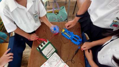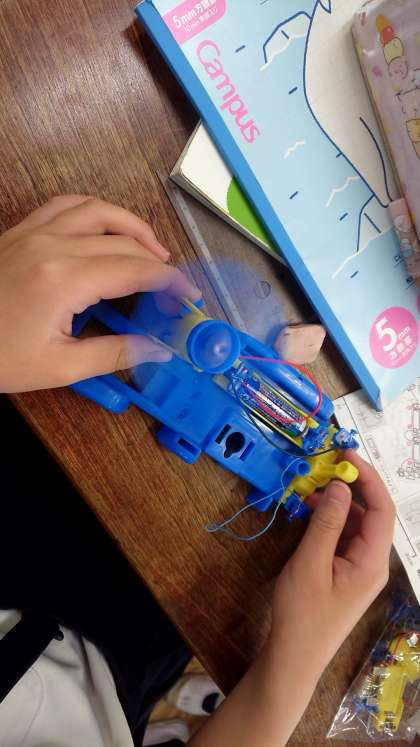 乾電池をつなぐ向きとモーターの回る向きにはどんな関係があるのか学習しました。乾電池のつなぐ向きとモーターの回る向きは同じで、つなぐ向きを変えるとモーターの回る向きも変わると予想が出ました。実験してみると乾電池の向きを変えたら、プロペラの回る向きが変わったり、電流計の触れる向きも変わったりしました。このことから、乾電池をつなぐ向きを変えると回路に流れる電流の向きが変わって、モーターの回る向きも変わることがわかりました。
