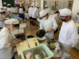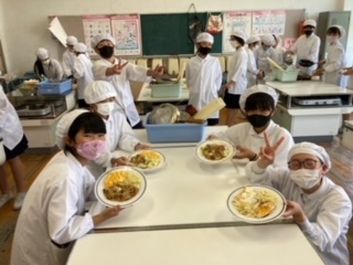 と話していました。できあがった料理を美味しそうに食べていました。明日は、6年1組が調理実習をします。