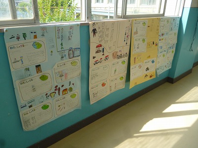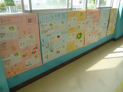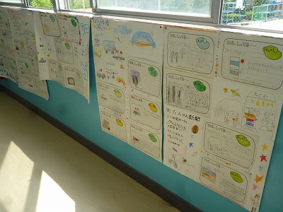2年生が取り組んでいた「町たんけん」のまとめの新聞が各クラスとも出来上がり、教室前の廊下の壁に掲示されています。