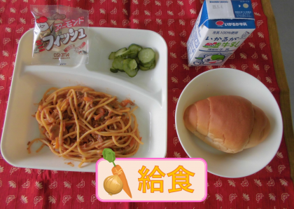 スパゲッティミートソース、きゅうりのピクルス、アーモンドフィッシュ、1/2黒糖パン、牛乳