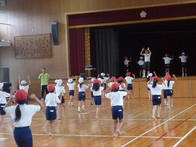 リズムに合わせて体を動かしていきます。まだ、そんなには練習していないと思うのですが、先生の動きをしっかりと覚えている子も多く、ミニ先生として前や舞台上で踊ってくれる子もいました。
