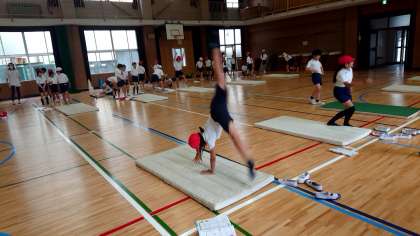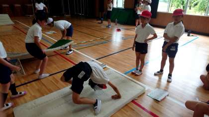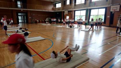 雨が強くなってきていたので、プール水泳を中止して講堂でマット運動をしました。最初に、前回の復習として前転や後転、側方倒立回転をしました。次に、倒立からのブリッジをしました。ブリッジだけをする場合と違って、倒立からの連続した動きが難しかったです。最後に、ロンダートをしました。側方倒立回転からの発展技だったので、できるようになるまで何回も練習しました。