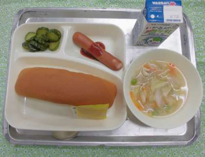 ウインナーのケチャップソース、スープ、きゅうりのサラダ、大コッペパン、アプリコットジャム、牛乳
